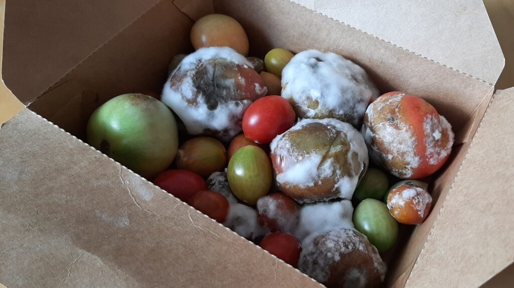 The first one was similar to kaki ripening. Just put unripe tomatoes and apples together in a box and check periodically. This method works to some extent, if you really check often. A couple of days of neglect and everything could be lost – just check the picture.