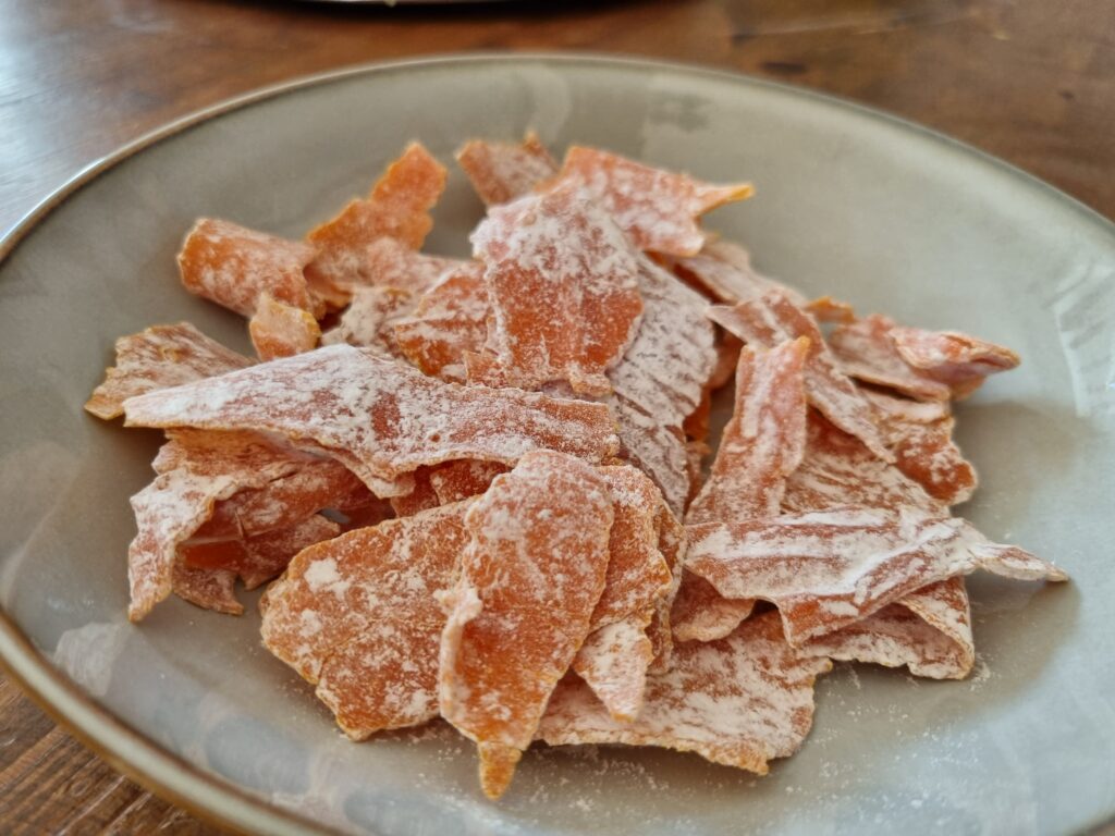 Super sweet, a little sour and pumpkin tasting. A perfect snack for the autumn. All you need is a Hokkaido pumpkin and some powdered sugar. Peel, clean and dice the pumpkin. Cook it for 30 minutes, drain the water and squash it to a pulp. If the pulp is still fairly liquid, cook it some more to get a nice thick paste. Spread the paste on baking paper as thinly as possible, 1 millimeter thick is ideal. Dry the paste, preferably in the oven at 50 C for 3 hours. Let it cool down and cut it into pieces. Generously powder with powdered sugar and you are ready to go. You can also use other pumpkins, like Japanese chestnut pumpkin – perfect.