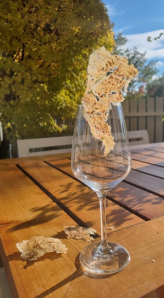 The trick is to use the right proportions – about 1:10 ratio of bread crumbs and water is the right one. Just heat it up in a microwave oven and you should end up with a thick, pudding-like paste – that is the consistency that you want, not anything more fluid. Add spices like salt, herbs, garlic, chili or whatever comes to your mind. Mix well and spread on a baking paper about 1-2 mm thin. It looks thick, but if you consider that around 90% of the paste is water, you can imagine the final thickness. Dry in an oven at around 85 °C until dry – usually 1-2 hours. Finished – serve as an appetizer with a nice cocktail or a cold beer.